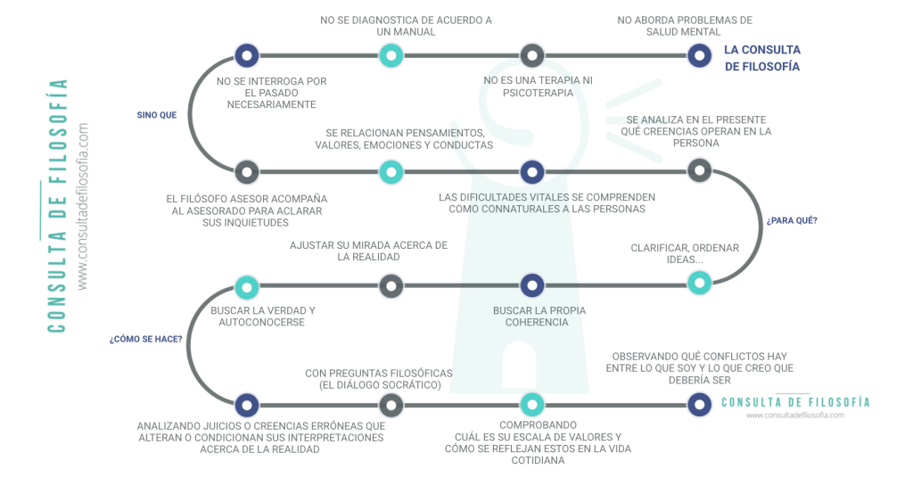 La Consulta de Filosofía es una relación de ayuda en la que el asesorado busca conocerse a sí mismo. Sus inquietudes no son de naturaleza psicológica sino que son causa de la concepción que tienen de sí mismos, de su interpretación de la realidad, de sus relaciones o de los parámetros con los que analizan su vida.